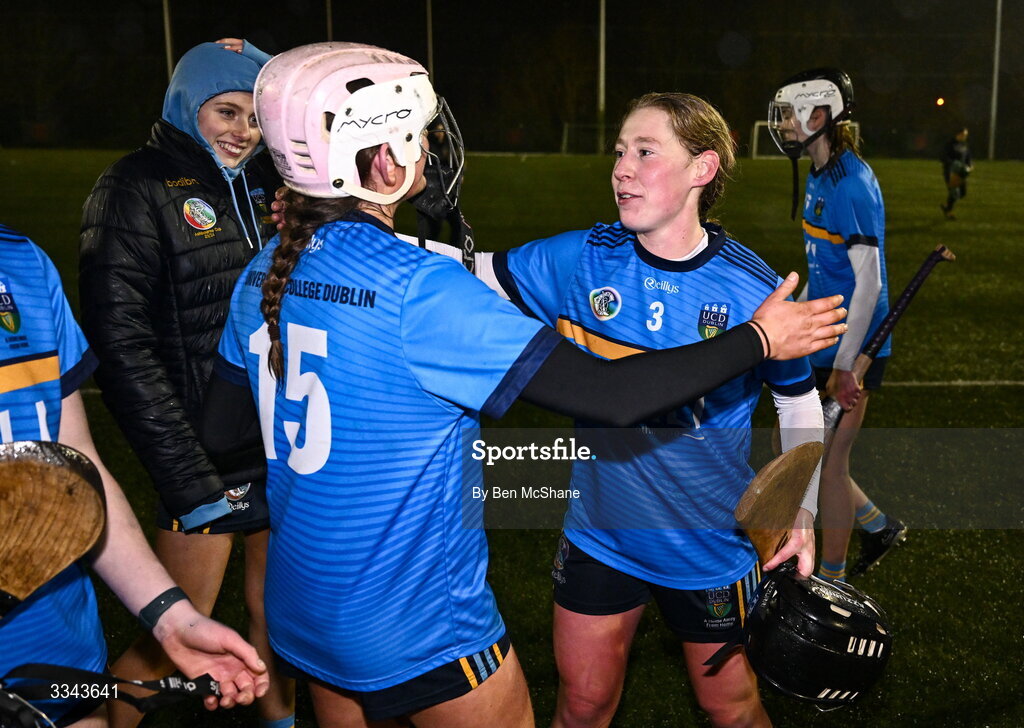 3 February 2026; Emily Adderly, right, and Amy Carey of University College Dublin celebrate after the Ashbourne Cup semi-final match between UCD and DCU at the DCU Sportsground in Dublin. Photo by Ben McShane/Sportsfile