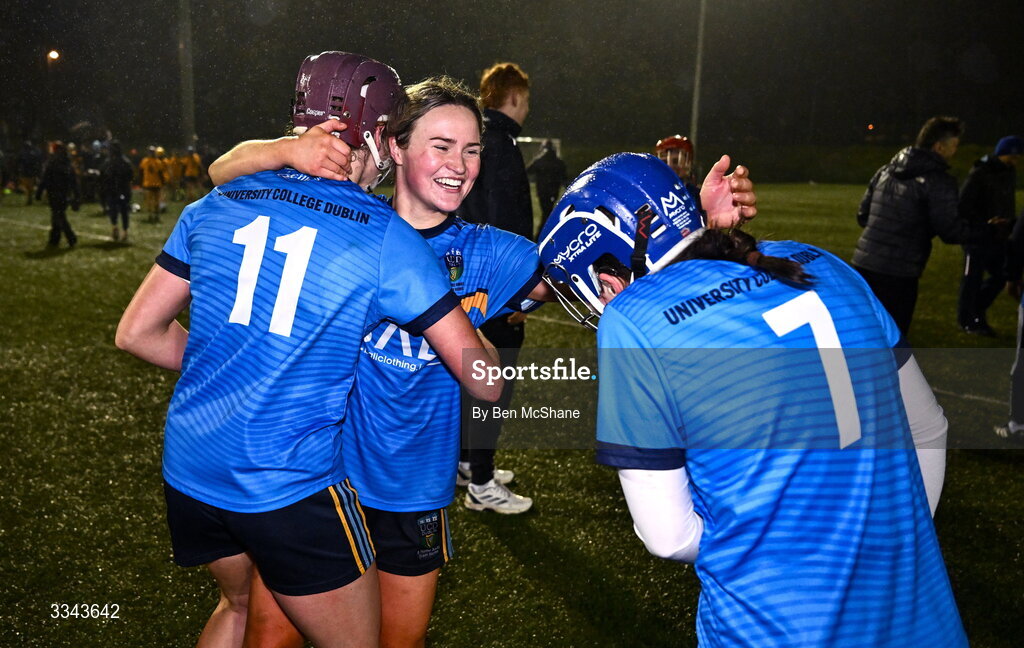 3 February 2026; University College Dublin players, from left, Sibéal Cherry, Alannah McNulty and Laoise Nolan celebrate after the Ashbourne Cup semi-final match between UCD and DCU at the DCU Sportsground in Dublin. Photo by Ben McShane/Sportsfile