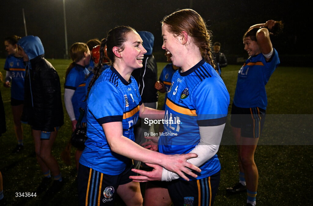3 February 2026; Aoibhin Lally, left, and Katie Ryan of University College Dublin celebrate after the Ashbourne Cup semi-final match between UCD and DCU at the DCU Sportsground in Dublin. Photo by Ben McShane/Sportsfile