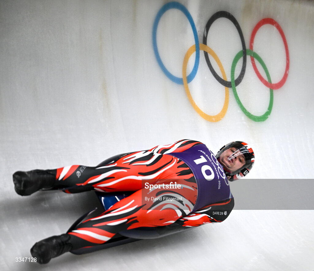 4 February 2026; Jonas Mueller of Austria during the Men's Luge training on day minus two of the Milano Cortina 2026 Winter Olympics at the Olympic sliding centre in Cortina, Italy. Photo by David Fitzgerald/Sportsfile