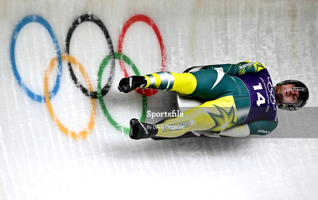 4 February 2026; Alexander Ferlazzo of Australia during the Men's Luge training on day minus two of the Milano Cortina 2026 Winter Olympics at the Olympic sliding centre in Cortina, Italy. Photo by David Fitzgerald/Sportsfile