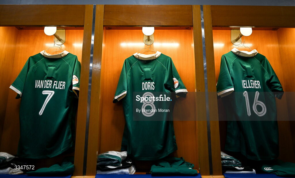 5 February 2026; The jerseys of Josh van der Flier, Caelan Doris and Rónan Kelleher in the Ireland dressing room before the Guinness 6 Nations Rugby Championship match between France and Ireland at Stade de France in Paris, France. Photo by Brendan Moran/Sportsfile
