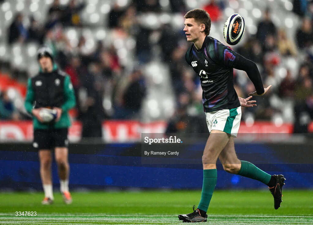 5 February 2026; Sam Prendergast of Ireland before the Guinness 6 Nations Rugby Championship match between France and Ireland at Stade de France in Paris, France. Photo by Ramsey Cardy/Sportsfile