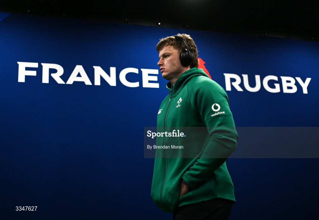 5 February 2026; Cian Prendergast of Ireland walks out before the Guinness 6 Nations Rugby Championship match between France and Ireland at Stade de France in Paris, France. Photo by Brendan Moran/Sportsfile