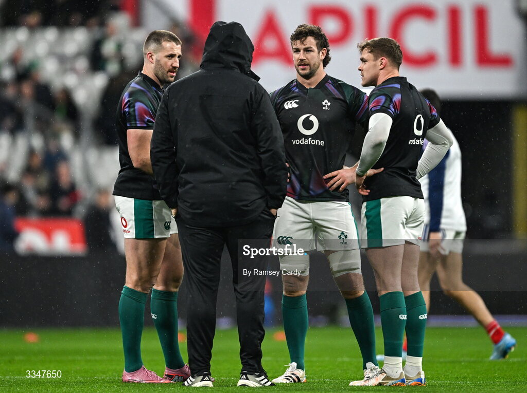 5 February 2026; Ireland head coach Andy Farrell speaks to Ireland players, from left, Stuart McCloskey, Caelan Doris and Garry Ringrose before the Guinness 6 Nations Rugby Championship match between France and Ireland at Stade de France in Paris, France. Photo by Ramsey Cardy/Sportsfile