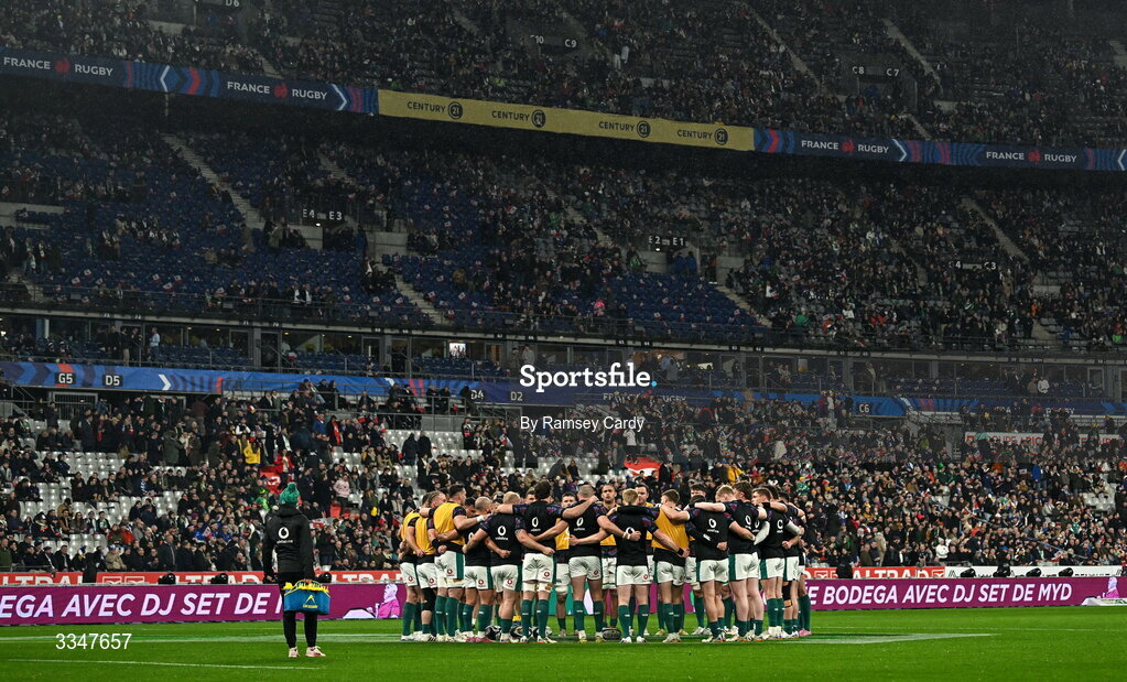 5 February 2026; The Ireland squad huddle before the Guinness 6 Nations Rugby Championship match between France and Ireland at Stade de France in Paris, France. Photo by Ramsey Cardy/Sportsfile