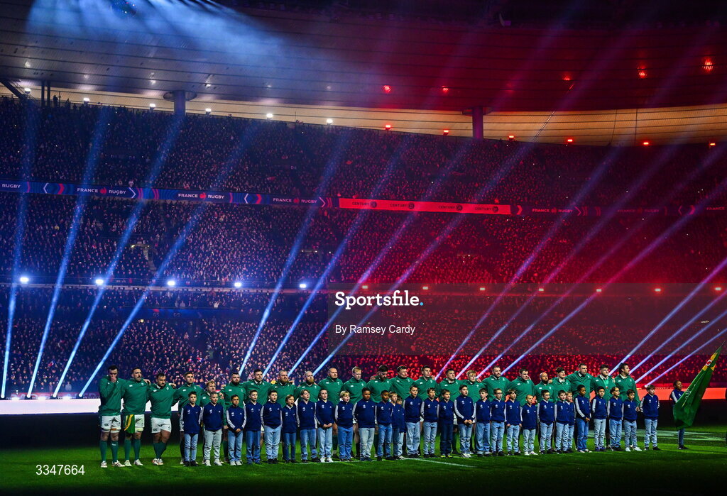 5 February 2026; Ireland players during the national anthem before the Guinness 6 Nations Rugby Championship match between France and Ireland at Stade de France in Paris, France. Photo by Ramsey Cardy/Sportsfile
