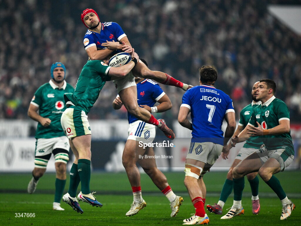 5 February 2026; Louis Bielle-Biarrey of France in action against Tommy O'Brien of Ireland during the Guinness 6 Nations Rugby Championship match between France and Ireland at Stade de France in Paris, France. Photo by Brendan Moran/Sportsfile