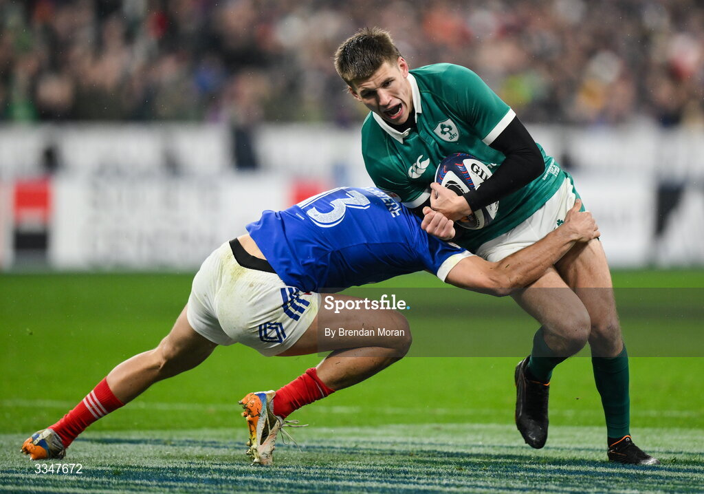 5 February 2026; Sam Prendergast of Ireland is tackled by Nicolas Depoortère of France during the Guinness 6 Nations Rugby Championship match between France and Ireland at Stade de France in Paris, France. Photo by Brendan Moran/Sportsfile