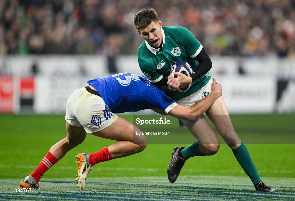 5 February 2026; Sam Prendergast of Ireland is tackled by Nicolas Depoortère of France during the Guinness 6 Nations Rugby Championship match between France and Ireland at Stade de France in Paris, France. Photo by Brendan Moran/Sportsfile