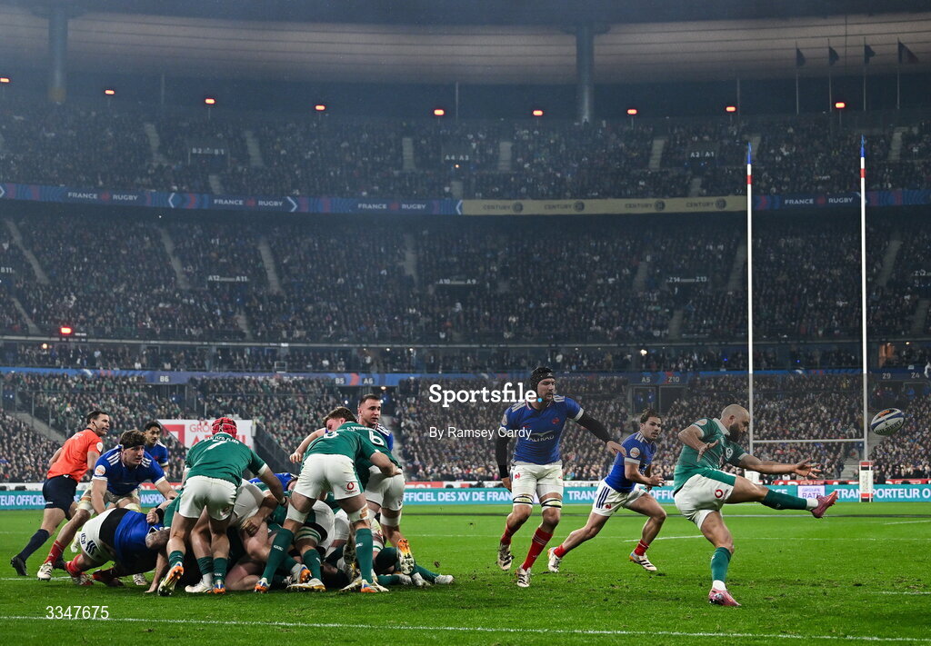 5 February 2026; Jamison Gibson-Park of Ireland clears from the back of the scrum during the Guinness 6 Nations Rugby Championship match between France and Ireland at Stade de France in Paris, France. Photo by Ramsey Cardy/Sportsfile