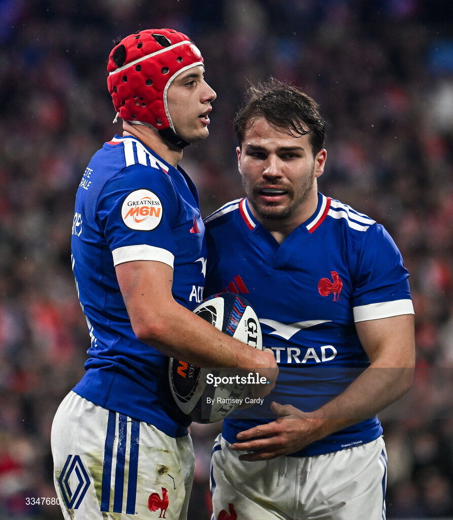 5 February 2026; Louis Bielle-Biarrey of France, left, celebrates with teammate Antoine Dupont after scoring their side's first try during the Guinness 6 Nations Rugby Championship match between France and Ireland at Stade de France in Paris, France. Photo by Ramsey Cardy/Sportsfile
