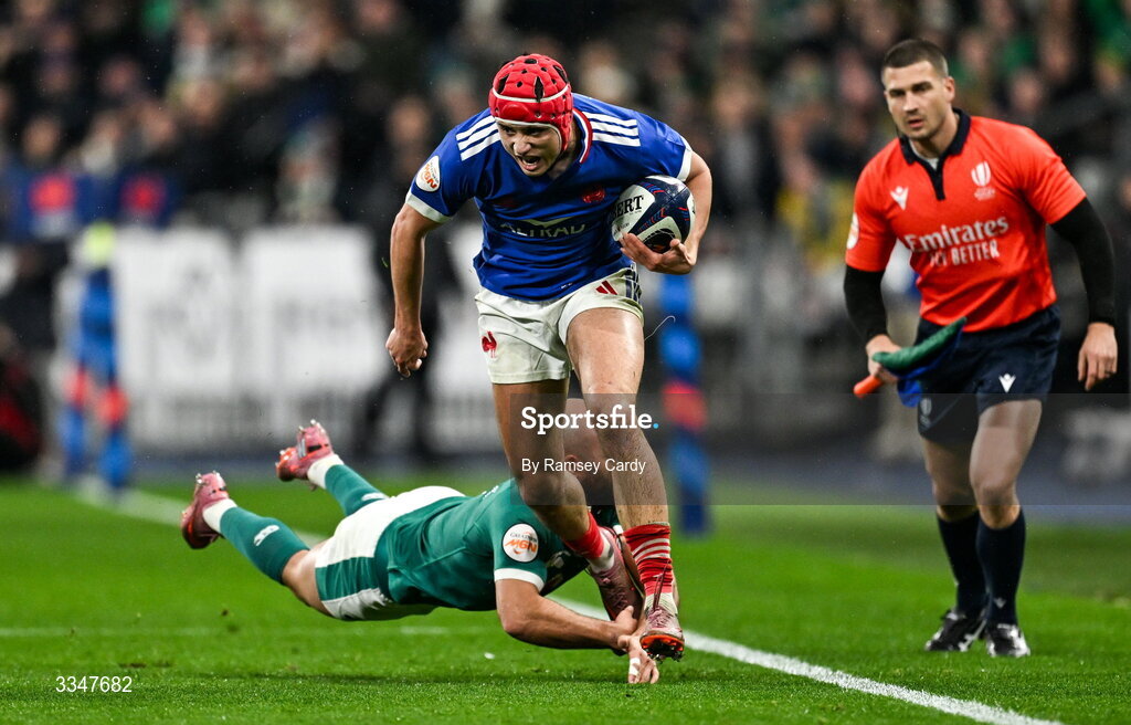 5 February 2026; Louis Bielle-Biarrey of France evades the tackle from Jamison Gibson-Park of Ireland on his way to scoring his side's first try during the Guinness 6 Nations Rugby Championship match between France and Ireland at Stade de France in Paris, France. Photo by Ramsey Cardy/Sportsfile