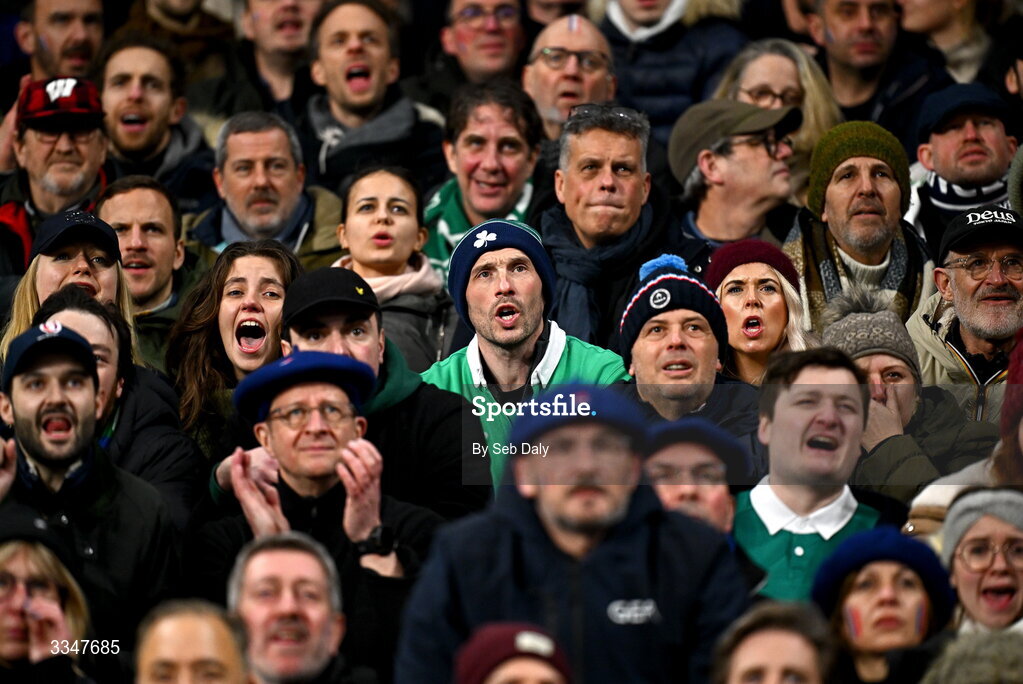 5 February 2026; An Ireland supporter during the Guinness 6 Nations Rugby Championship match between France and Ireland at Stade de France in Paris, France. Photo by Seb Daly/Sportsfile