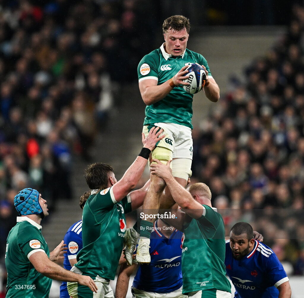5 February 2026; Cian Prendergast of Ireland wins possession from a lineout during the Guinness 6 Nations Rugby Championship match between France and Ireland at Stade de France in Paris, France. Photo by Ramsey Cardy/Sportsfile
