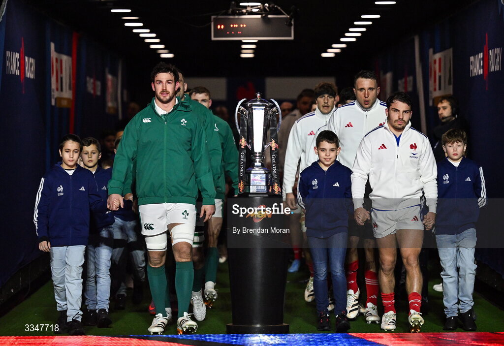 5 February 2026; Team captains Caelan Doris of Ireland and Antoine Dupont of France lead out their teams before the Guinness 6 Nations Rugby Championship match between France and Ireland at Stade de France in Paris, France. Photo by Brendan Moran/Sportsfile
