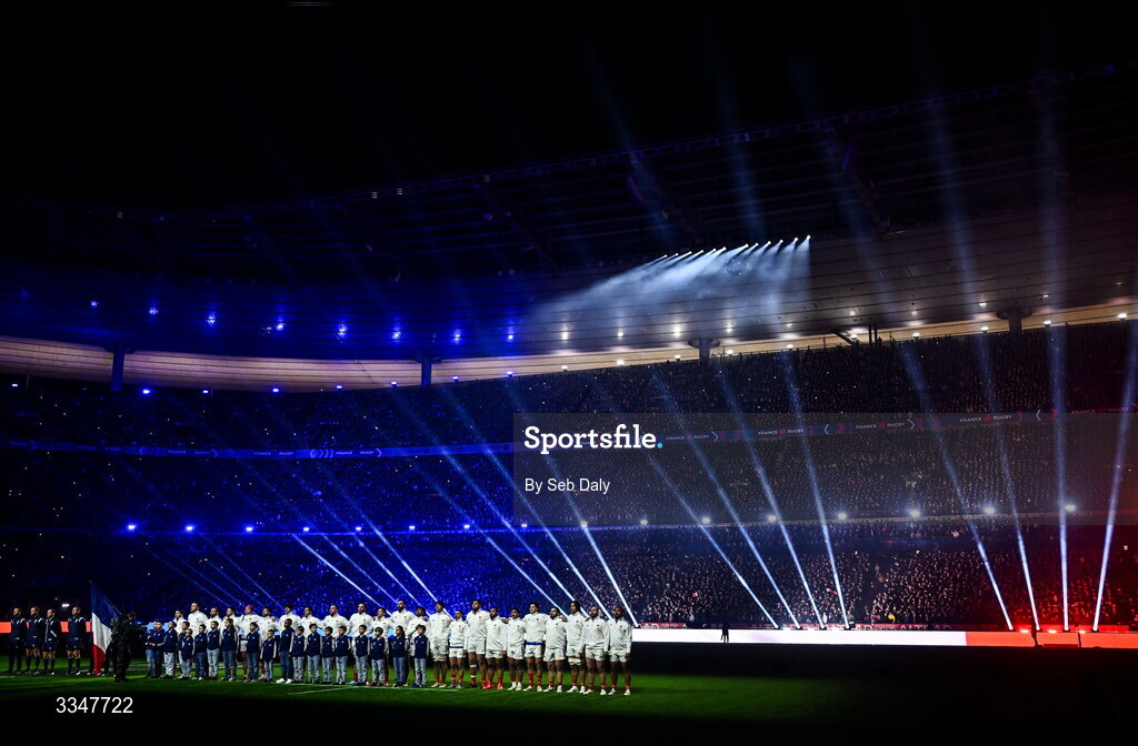 5 February 2026; France players during the national anthem before the Guinness 6 Nations Rugby Championship match between France and Ireland at Stade de France in Paris, France. Photo by Seb Daly/Sportsfile