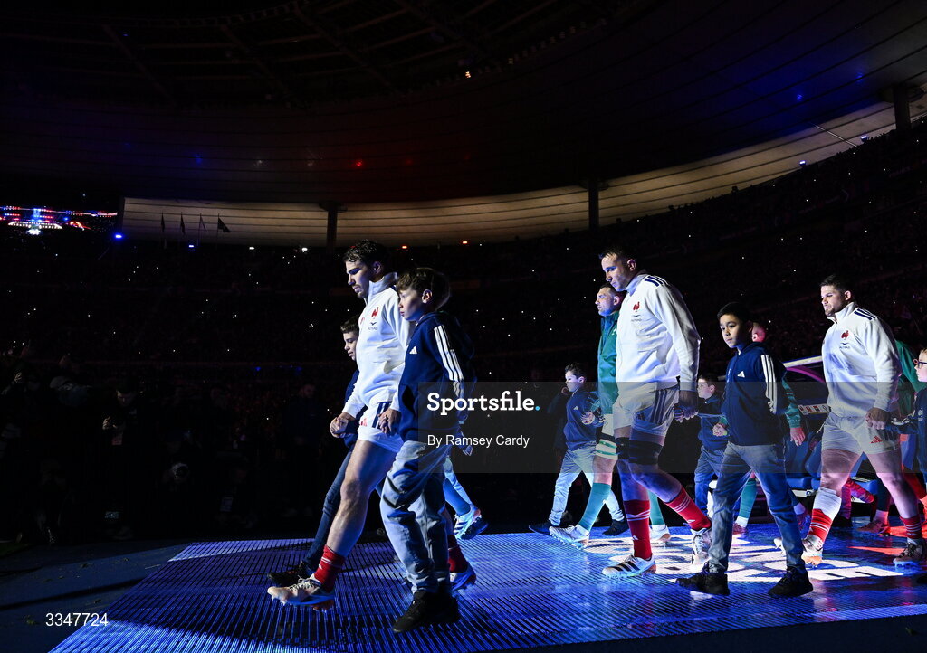 5 February 2026; Antoine Dupont of France leads out his team mates before the Guinness 6 Nations Rugby Championship match between France and Ireland at Stade de France in Paris, France. Photo by Ramsey Cardy/Sportsfile