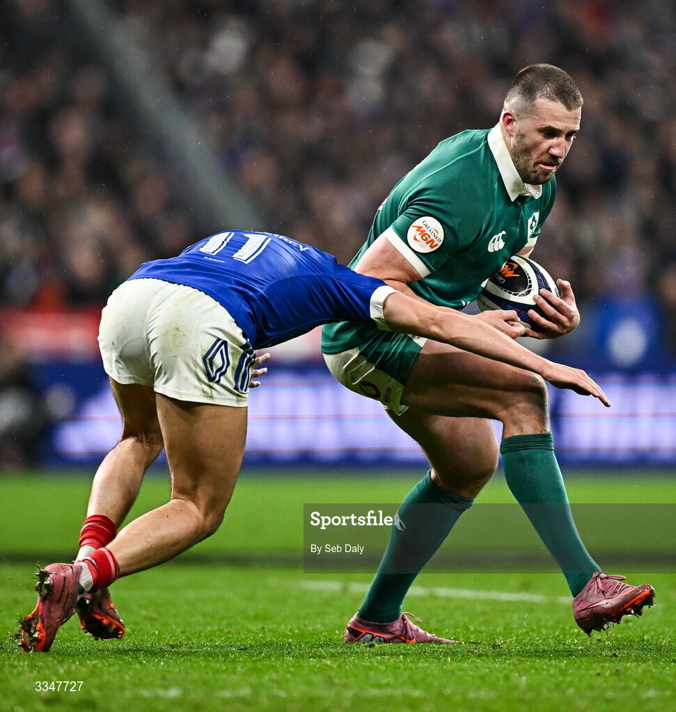 5 February 2026; Stuart McCloskey of Ireland is tackled by Louis Bielle-Biarrey of France during the Guinness 6 Nations Rugby Championship match between France and Ireland at Stade de France in Paris, France. Photo by Seb Daly/Sportsfile