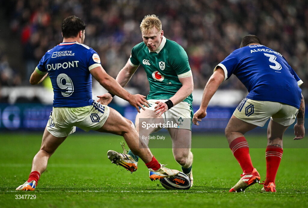 5 February 2026; Jamie Osborne of Ireland in action against Antoine Dupont, left, and Dorian Aldegheri of France during the Guinness 6 Nations Rugby Championship match between France and Ireland at Stade de France in Paris, France. Photo by Seb Daly/Sportsfile