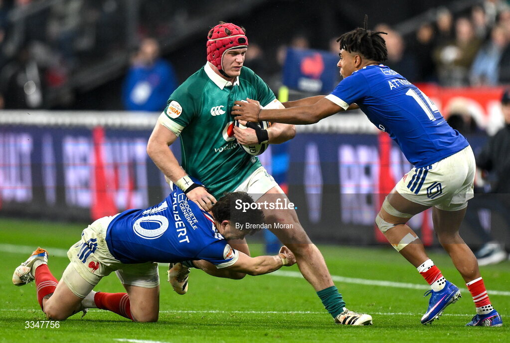 5 February 2026; Josh van der Flier of Ireland is tackled by Matthieu Jalibert, left, and Théo Attissogbe of France during the Guinness 6 Nations Rugby Championship match between France and Ireland at Stade de France in Paris, France. Photo by Brendan Moran/Sportsfile