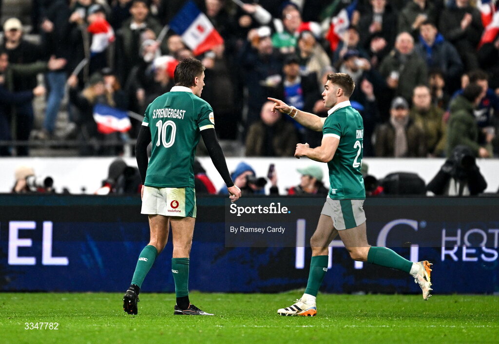 5 February 2026; Jack Crowley, right, and Sam Prendergast of Ireland during the Guinness 6 Nations Rugby Championship match between France and Ireland at Stade de France in Paris, France. Photo by Ramsey Cardy/Sportsfile