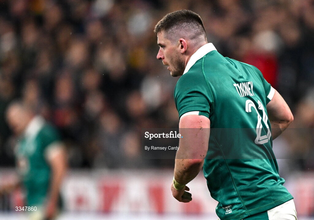 5 February 2026; Nick Timoney of Ireland after scoring his side's first try during the Guinness 6 Nations Rugby Championship match between France and Ireland at Stade de France in Paris, France. Photo by Ramsey Cardy/Sportsfile