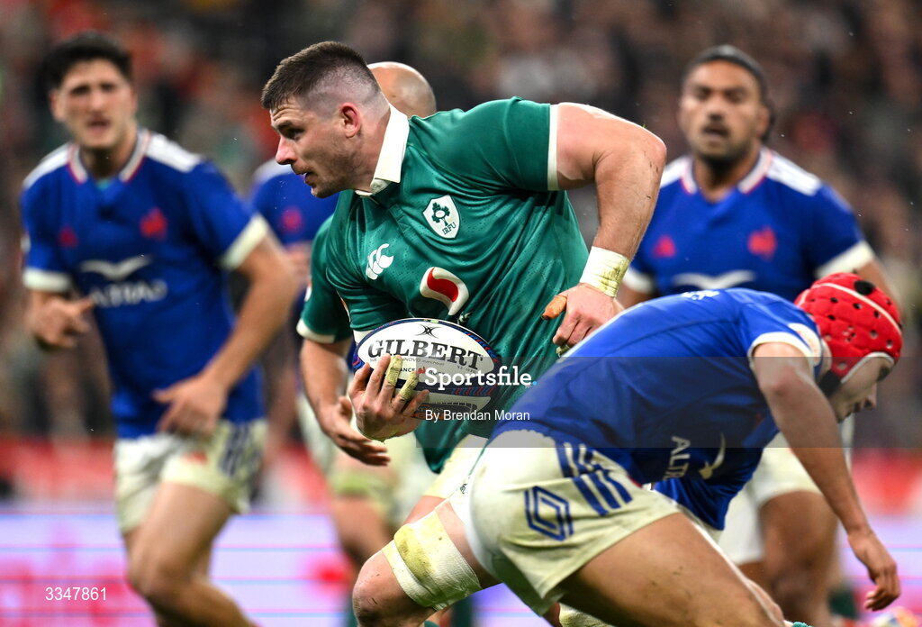 5 February 2026; Nick Timoney of Ireland gets past Louis Bielle-Biarrey of France on his way to scoring his side's first try during the Guinness 6 Nations Rugby Championship match between France and Ireland at Stade de France in Paris, France. Photo by Brendan Moran/Sportsfile