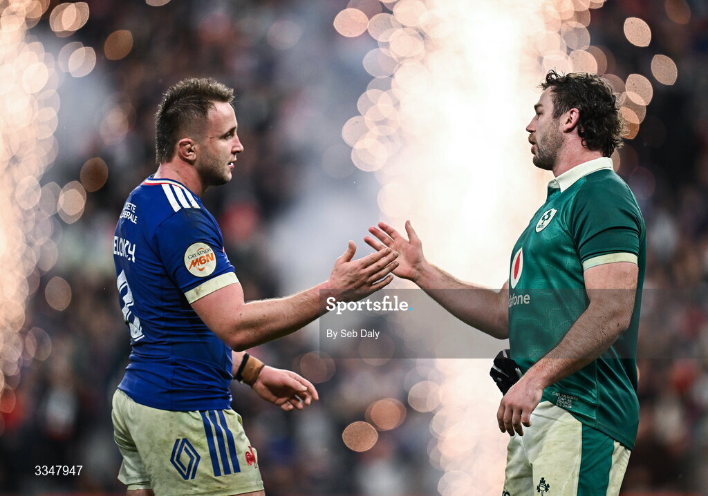 5 February 2026; Anthony Jelonch of France and Caelan Doris of Ireland shake hands after the Guinness 6 Nations Rugby Championship match between France and Ireland at Stade de France in Paris, France. Photo by Seb Daly/Sportsfile