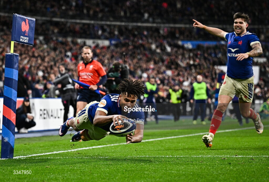 5 February 2026; Théo Attissogbe of France scores his side's fifth try during the Guinness 6 Nations Rugby Championship match between France and Ireland at Stade de France in Paris, France. Photo by Seb Daly/Sportsfile