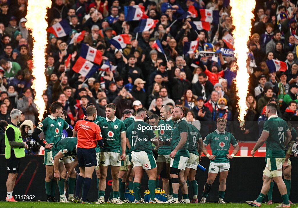 5 February 2026; Ireland players at the final whistle after the Guinness 6 Nations Rugby Championship match between France and Ireland at Stade de France in Paris, France. Photo by Ramsey Cardy/Sportsfile