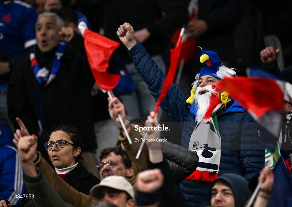 5 February 2026; France supporters celebrate during the Guinness 6 Nations Rugby Championship match between France and Ireland at Stade de France in Paris, France. Photo by Ramsey Cardy/Sportsfile