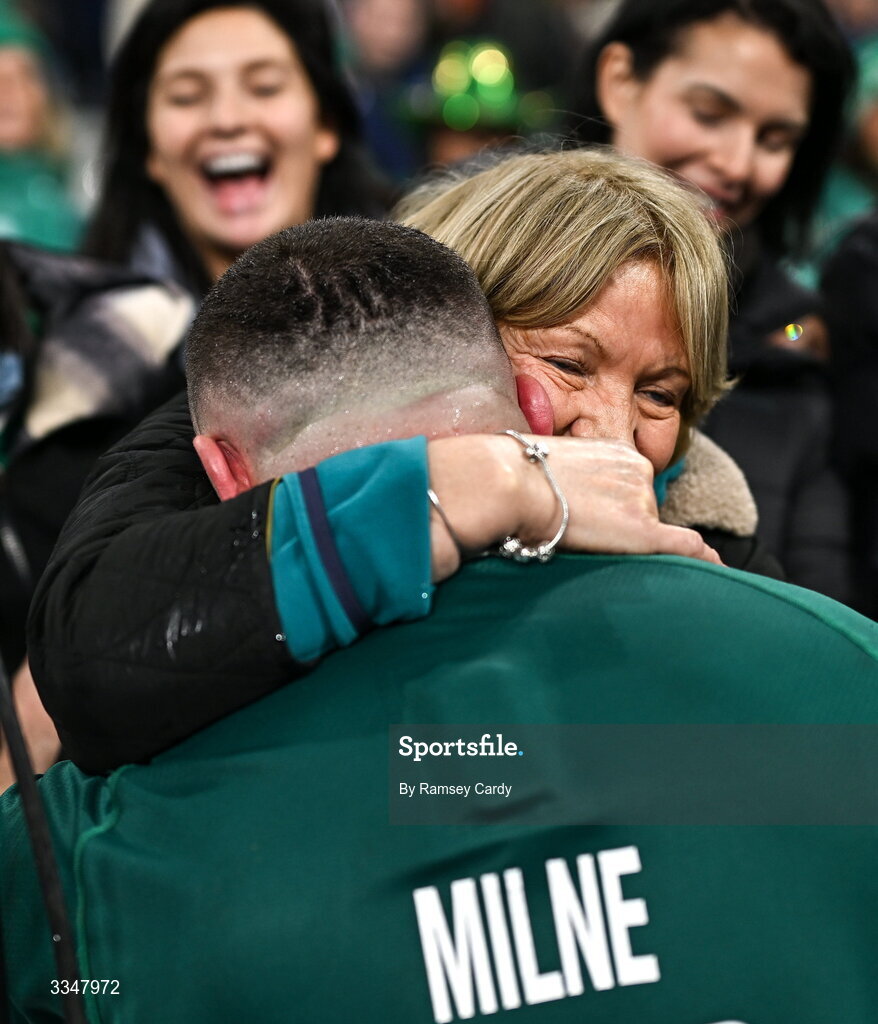 5 February 2026; Michael Milne of Ireland with his mother Pauline after the Guinness 6 Nations Rugby Championship match between France and Ireland at Stade de France in Paris, France. Photo by Ramsey Cardy/Sportsfile
