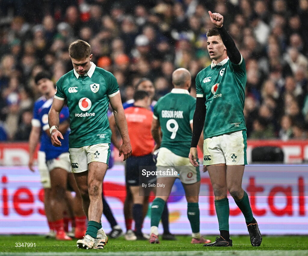 5 February 2026; Ireland players Sam Prendergast, right, and Jack Crowley during the Guinness 6 Nations Rugby Championship match between France and Ireland at Stade de France in Paris, France. Photo by Seb Daly/Sportsfile