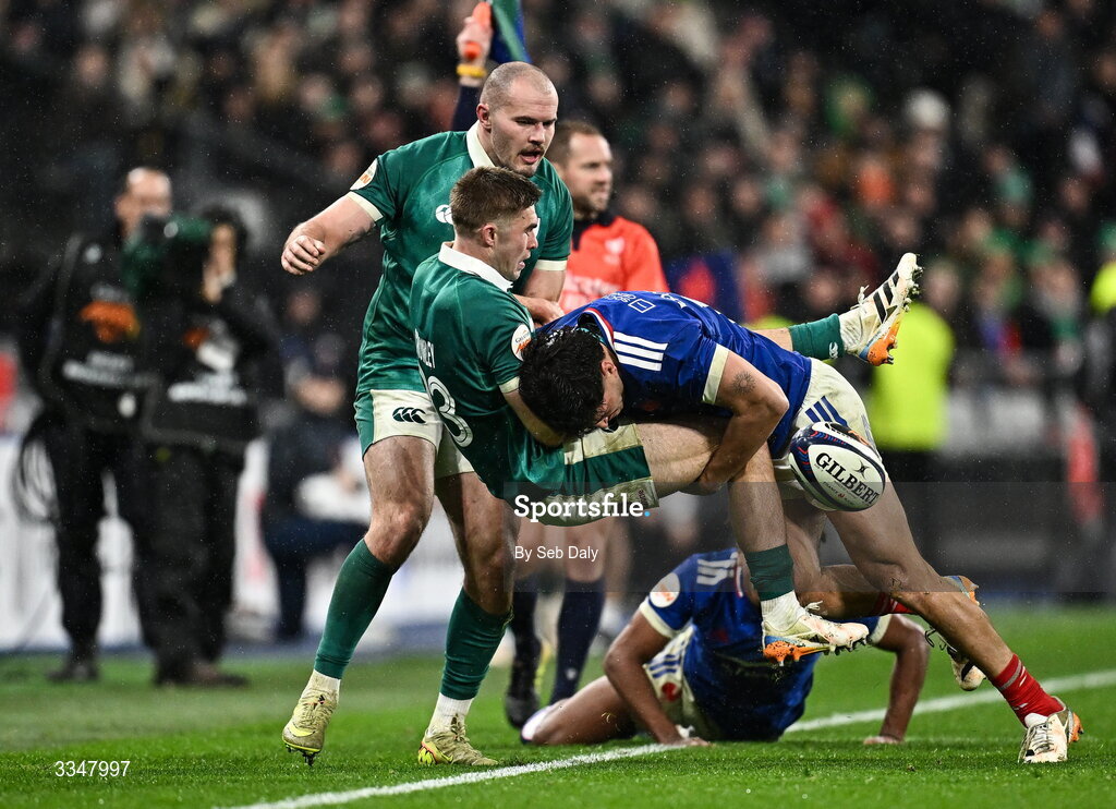 5 February 2026; Jack Crowley of Ireland is tackled by Nicolas Depoortère of France during the Guinness 6 Nations Rugby Championship match between France and Ireland at Stade de France in Paris, France. Photo by Seb Daly/Sportsfile