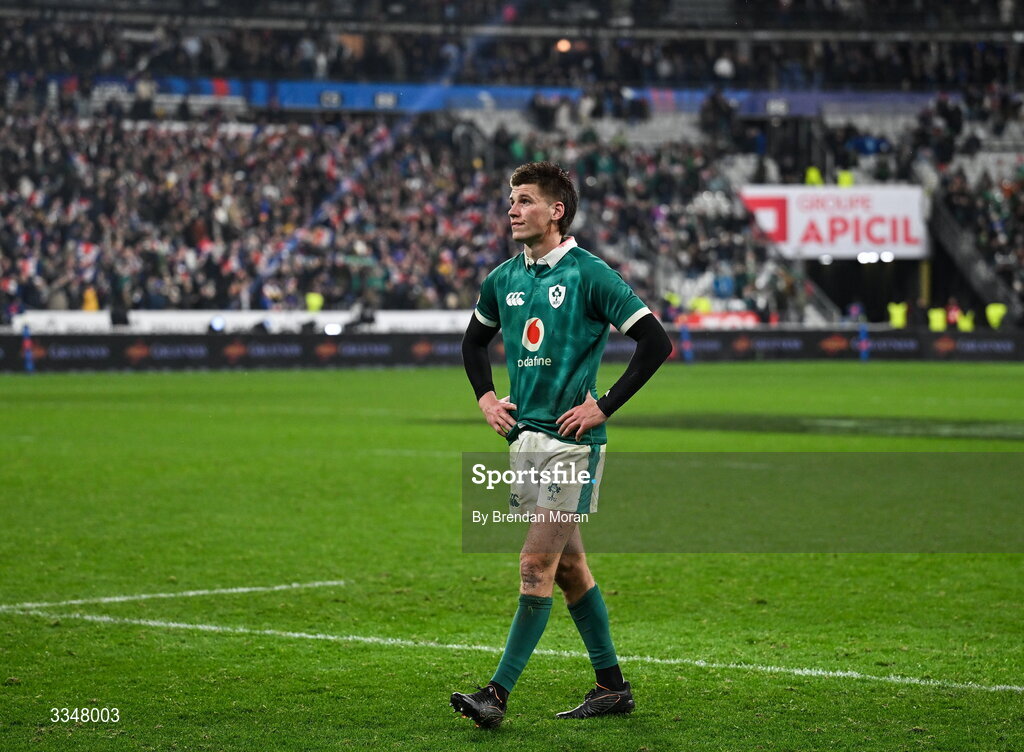 5 February 2026; Sam Prendergast of Ireland after the Guinness 6 Nations Rugby Championship match between France and Ireland at Stade de France in Paris, France. Photo by Brendan Moran/Sportsfile