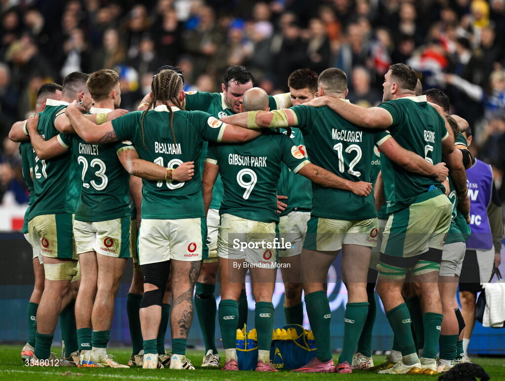 5 February 2026; Ireland players huddle after the Guinness 6 Nations Rugby Championship match between France and Ireland at Stade de France in Paris, France. Photo by Brendan Moran/Sportsfile