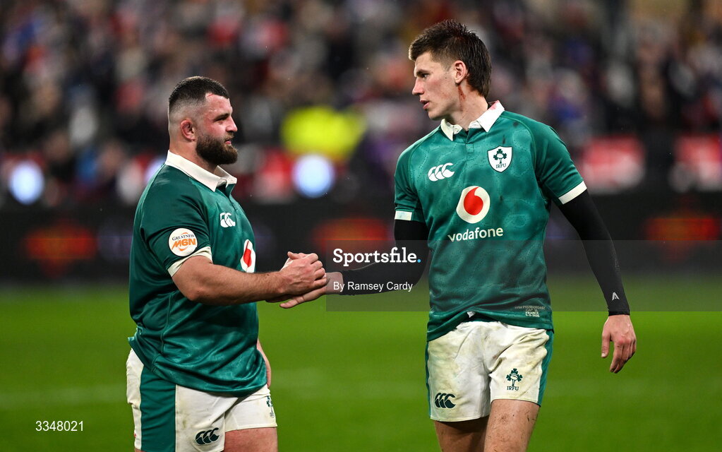 5 February 2026; Ireland players Michael Milne, left, and Sam Prendergast after the Guinness 6 Nations Rugby Championship match between France and Ireland at Stade de France in Paris, France. Photo by Ramsey Cardy/Sportsfile