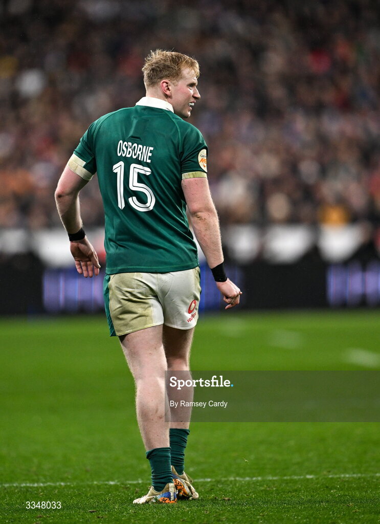 5 February 2026; Jamie Osborne of Ireland during the Guinness 6 Nations Rugby Championship match between France and Ireland at Stade de France in Paris, France. Photo by Ramsey Cardy/Sportsfile