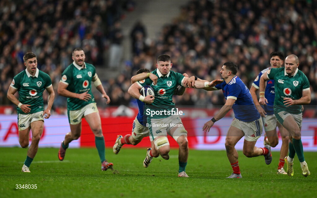 5 February 2026; Nick Timoney of Ireland is tackled by Matthieu Jalibert and Thomas Ramos of France during the Guinness 6 Nations Rugby Championship match between France and Ireland at Stade de France in Paris, France. Photo by Brendan Moran/Sportsfile