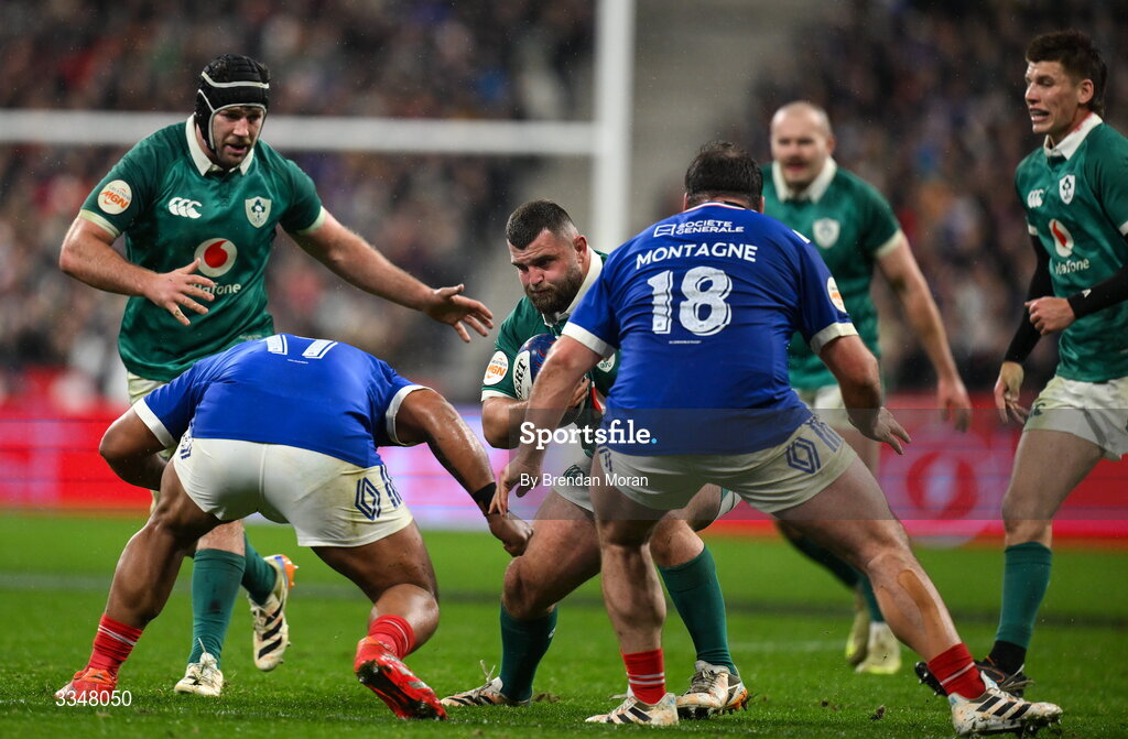 5 February 2026; Michael Milne of Ireland during the Guinness 6 Nations Rugby Championship match between France and Ireland at Stade de France in Paris, France. Photo by Brendan Moran/Sportsfile