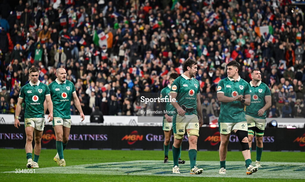 5 February 2026; Ireland players, from left, Jack Crowley, Jacob Stockdale, Caelan Doris, Dan Sheehan and Tadhg Beirne after the Guinness 6 Nations Rugby Championship match between France and Ireland at Stade de France in Paris, France. Photo by Brendan Moran/Sportsfile