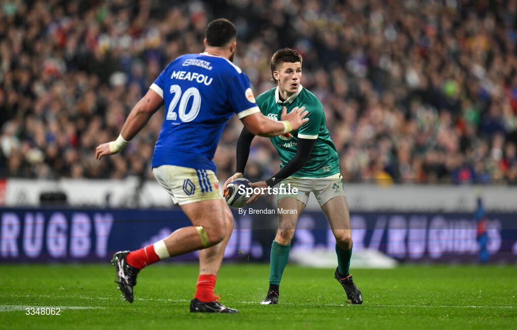 5 February 2026; Sam Prendergast of Ireland in action against Emmanuel Meafou of France during the Guinness 6 Nations Rugby Championship match between France and Ireland at Stade de France in Paris, France. Photo by Brendan Moran/Sportsfile