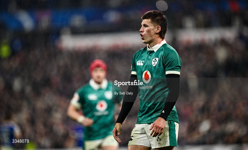 5 February 2026; Sam Prendergast of Ireland during the Guinness 6 Nations Rugby Championship match between France and Ireland at Stade de France in Paris, France. Photo by Seb Daly/Sportsfile