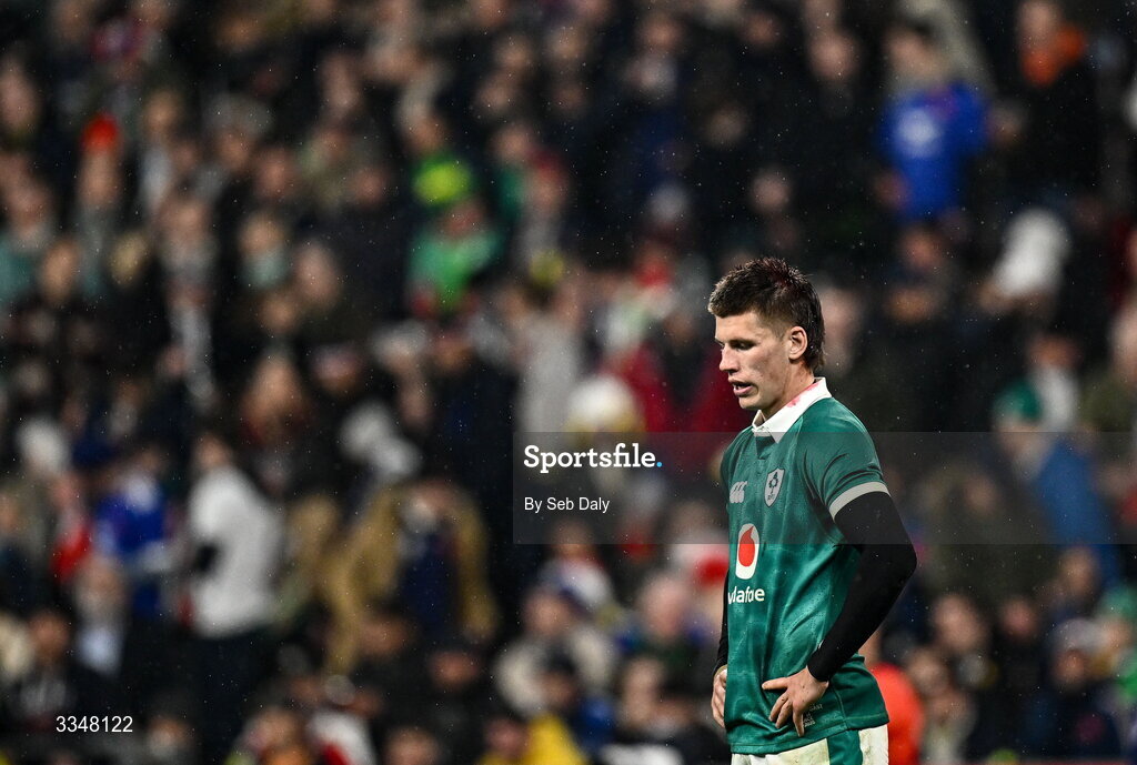 5 February 2026; Sam Prendergast of Ireland during the Guinness 6 Nations Rugby Championship match between France and Ireland at Stade de France in Paris, France. Photo by Seb Daly/Sportsfile