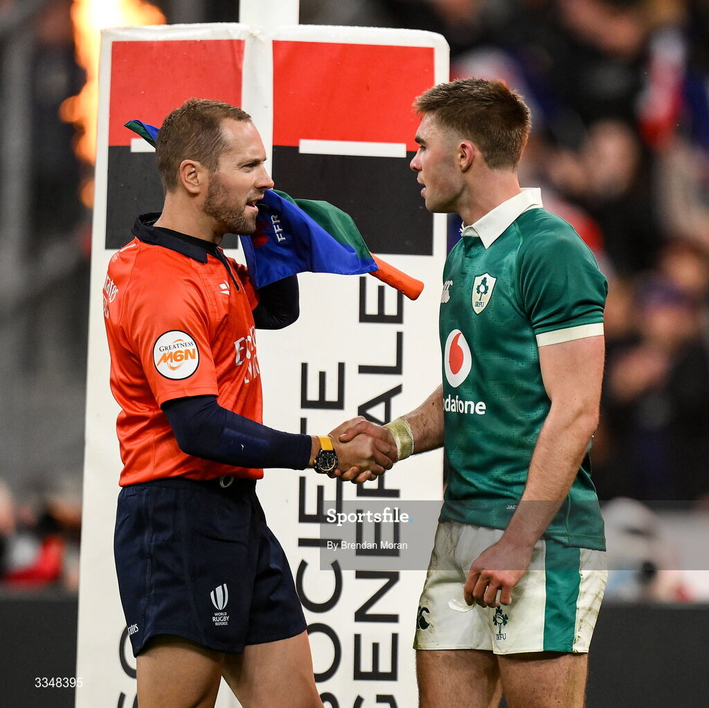 5 February 2026; Jack Crowley of Ireland shakes hands with assistant referee Angus Gardner after during the Guinness 6 Nations Rugby Championship match between France and Ireland at Stade de France in Paris, France. Photo by Brendan Moran/Sportsfile