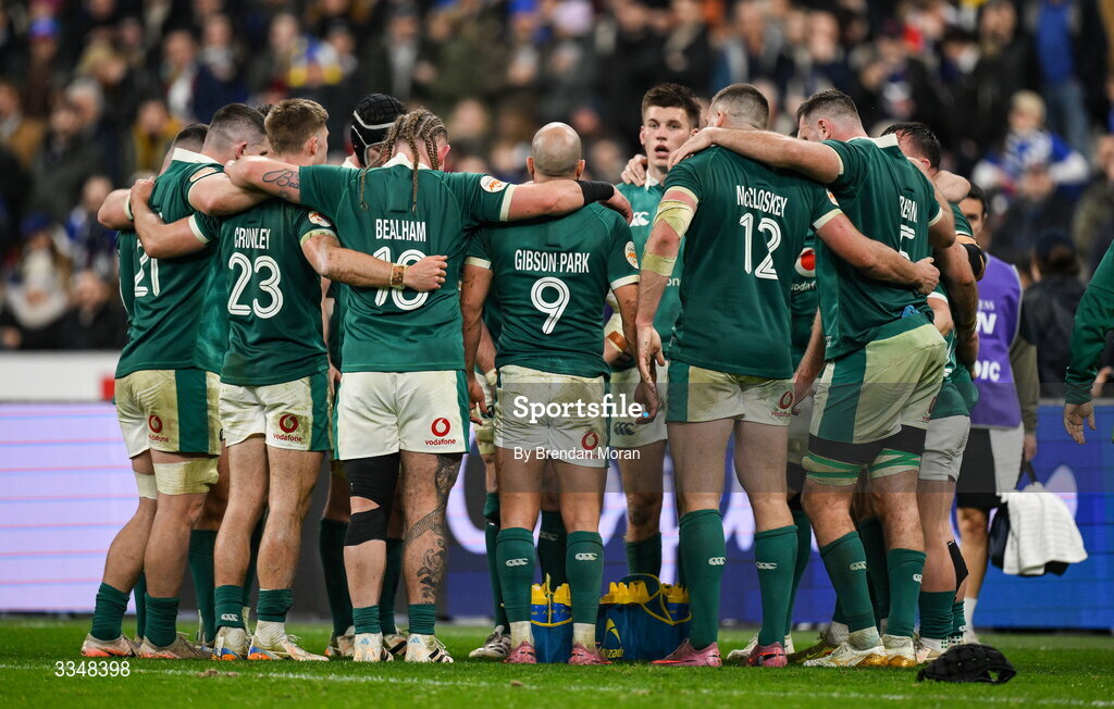 5 February 2026; The Ireland team huddle at the end of the Guinness 6 Nations Rugby Championship match between France and Ireland at Stade de France in Paris, France. Photo by Brendan Moran/Sportsfile