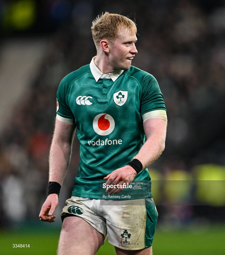 5 February 2026; Jamie Osborne of Ireland during the Guinness 6 Nations Rugby Championship match between France and Ireland at Stade de France in Paris, France. Photo by Ramsey Cardy/Sportsfile