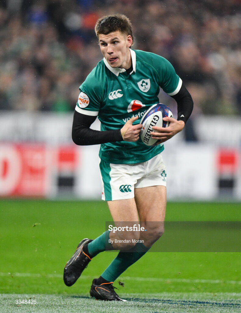 5 February 2026; Sam Prendergast of Ireland during the Guinness 6 Nations Rugby Championship match between France and Ireland at Stade de France in Paris, France. Photo by Brendan Moran/Sportsfile
