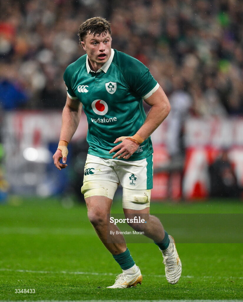 5 February 2026; Cian Prendergast of Ireland during the Guinness 6 Nations Rugby Championship match between France and Ireland at Stade de France in Paris, France. Photo by Brendan Moran/Sportsfile
